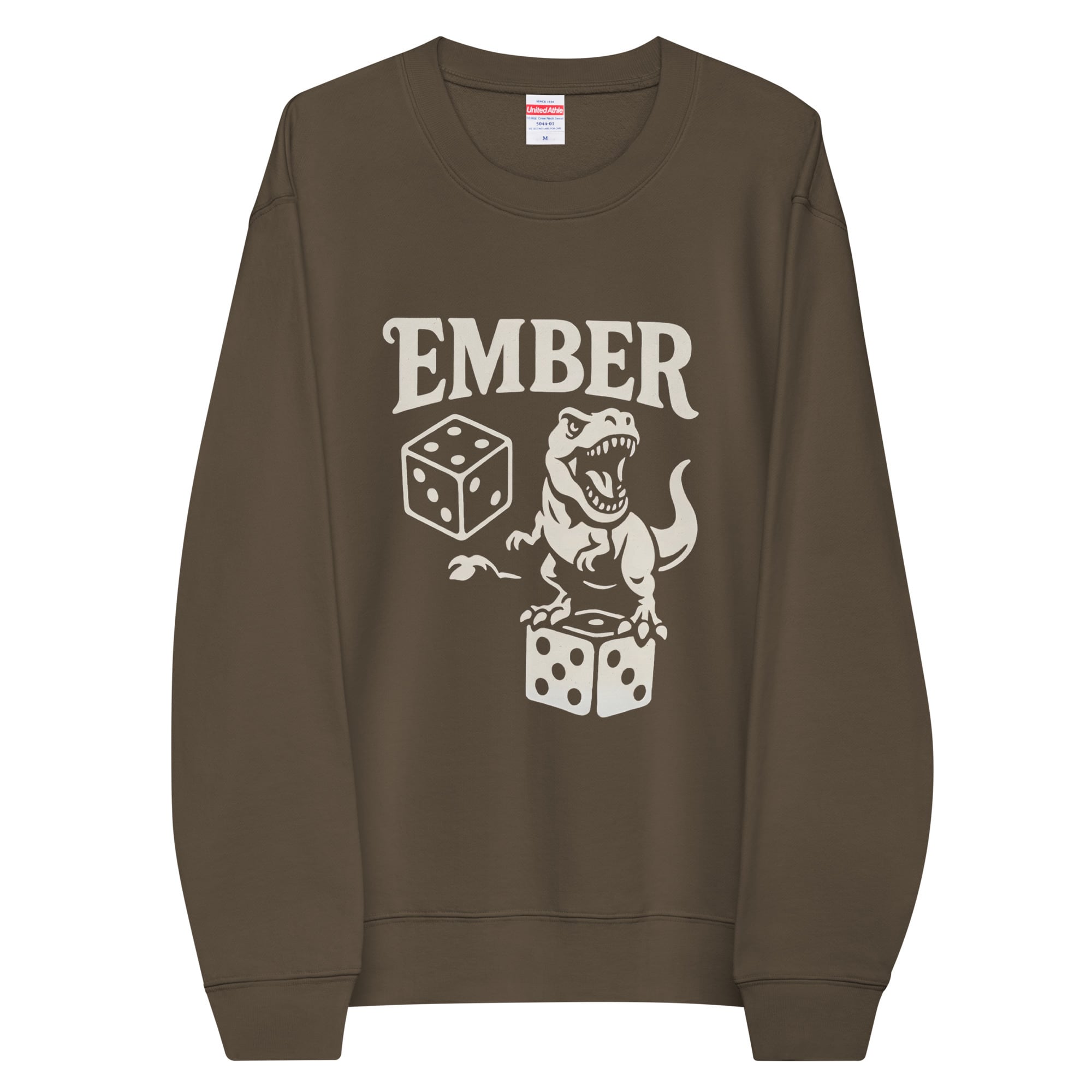 大胆なティラノサウルスとダイスのグラフィックが印象的なスウェット。